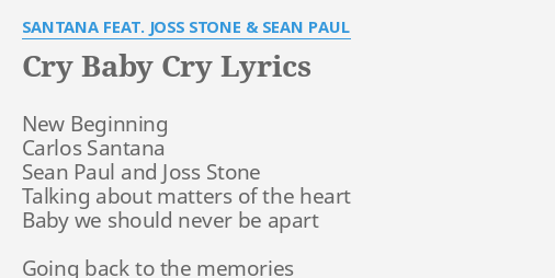 Check amazon for Cry Baby Cry mp3 download browse other artists under SS2 S3 S4 S5 S6 S7 S8 S9 S10 S11 S12 S13 Songwriters. Bug Music Emi Music Publishing Ltd Emi Blackwood Music Inc Whorgamusica SonyATV Tunes LLC Emi April Music Inc Comet-music Corp Apollinaire Music. Mirenlo esta muy bueno. Cry Baby Cry tradução Sean Paul. Cry Baby Cry Lyrics. Santana Joss Stone de Sean Paul música para ouvir com letra tradução e vídeo no Kboing. Cry Baby Cry Composição. Sean Paul and Joss Stone. Cry Baby Cry - Letras de Sean Paul.